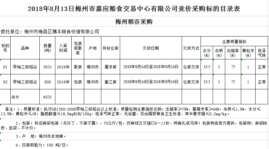 受客戶(hù)委托,梅州市嘉應(yīng)糧食交易中心有限公司定于2018年8月13日(星期一)舉辦糧食競(jìng)價(jià)交易會(huì),梅州市梅縣區(qū)穗豐糧食收儲(chǔ)有限公司擬采購(gòu)2018年早秈稻4031噸。