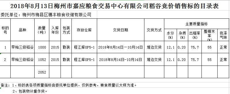 交易時間和地點:2018年8月13日(星期一)上午10時15分。廣東省梅州市彬芳大道南161號梅州市糧食交易中心3樓。