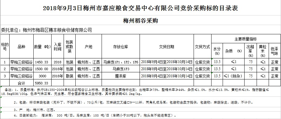 受客戶委托,梅州市嘉應(yīng)糧食交易中心有限公司定于2018年9月3日(星期一)舉辦糧食競價(jià)交易會(huì),梅州市梅縣區(qū)穗豐糧食收儲(chǔ)有限公司擬采購2018年早秈稻5950.33噸。