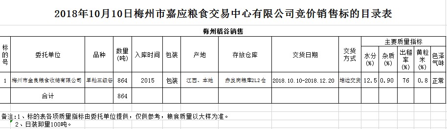 受客戶(hù)委托,梅州市嘉應(yīng)糧食交易中心有限公司定于2018年10月10日(星期三)舉辦糧食競(jìng)價(jià)交易會(huì),梅州市金良糧食收儲(chǔ)有限公司擬銷(xiāo)售2015年早秈稻864噸。