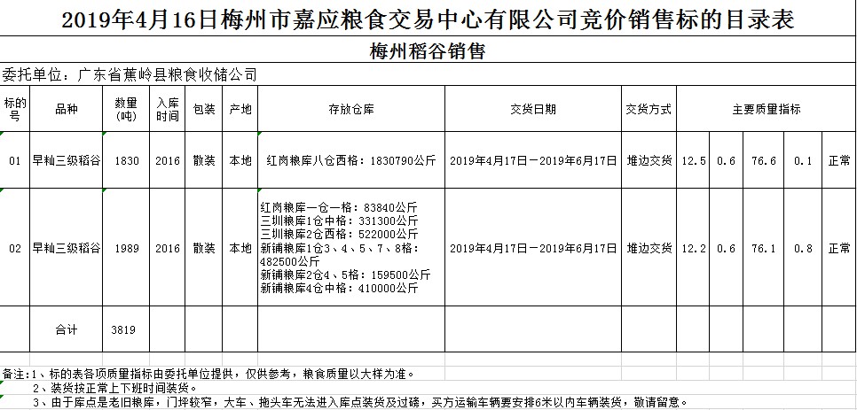 交易時(shí)間和地點(diǎn):2019年4月16日(星期二)上午10時(shí)。廣東省梅州市彬芳大道南161號(hào)梅州市糧食交易中心3樓。