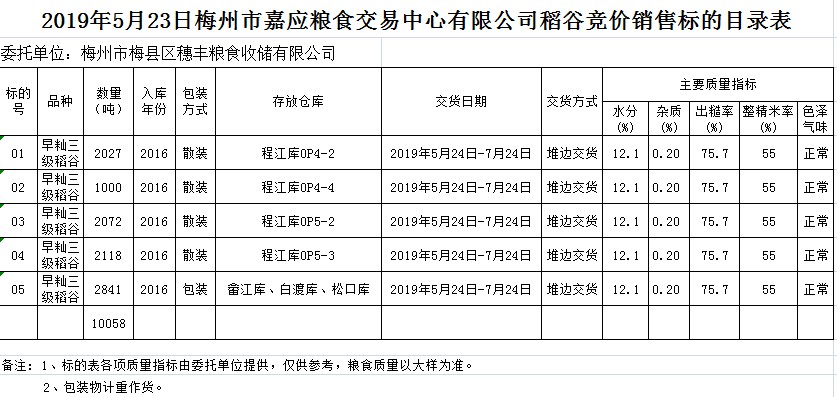 交易時間和地點:2019年5月23日(星期四)上午10時。廣東省梅州市彬芳大道南161號梅州市糧食交易中心3樓。