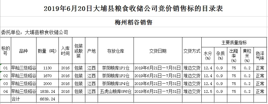 受客戶委托,梅州市嘉應(yīng)糧食交易中心有限公司定于2019年6月20日(星期四)舉辦糧食競價(jià)交易會(huì),大埔縣糧食收儲(chǔ)公司擬銷售2016年早秈稻6639.24噸。
