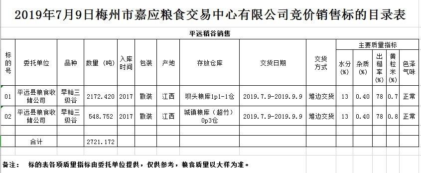 受客戶委托,梅州市嘉應糧食交易中心有限公司定于2019年7月9日(星期二)舉辦糧食競價交易會,平遠縣糧食收儲公司擬銷售2017年早秈稻2721.172噸。