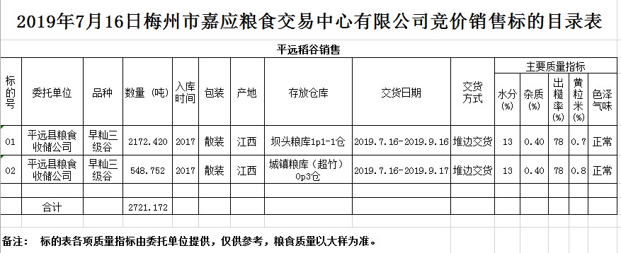 受客戶委托,梅州市嘉應(yīng)糧食交易中心有限公司定于2019年7月16日(星期二)舉辦糧食競價(jià)交易會,平遠(yuǎn)縣糧食收儲公司擬銷售2017年早秈稻2721.172噸。