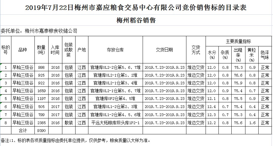受客戶委托,梅州市嘉應(yīng)糧食交易中心有限公司定于2019年7月22日(星期一)舉辦糧食競(jìng)價(jià)交易會(huì),梅州市嘉泰糧食收儲(chǔ)公司擬銷(xiāo)售2016年、2017年早秈稻9390噸。