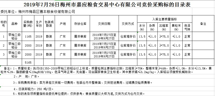 受客戶委托,梅州市嘉應(yīng)糧食交易中心有限公司定于2019年7月26日(星期五)舉辦糧食競價交易會,梅州市梅縣區(qū)穗豐糧食收儲有限公司擬采購2019年早秈稻5165噸。