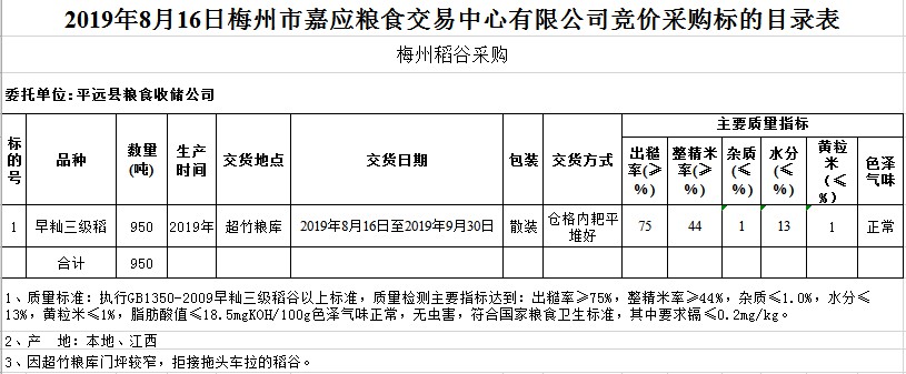 受客戶委托,梅州市嘉應(yīng)糧食交易中心有限公司定于2019年8月16日(星期五)舉辦糧食競價(jià)交易會,平遠(yuǎn)縣糧食收儲公司擬采購2019年早秈稻950噸。