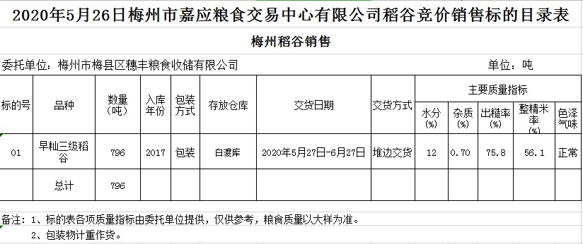 受客戶委托,梅州市嘉應(yīng)糧食交易中心有限公司定于2020年5月26日(星期二)舉辦糧食競(jìng)價(jià)交易會(huì),梅州市梅縣區(qū)穗豐糧食收儲(chǔ)有限公司擬銷售2017年早秈稻796噸。