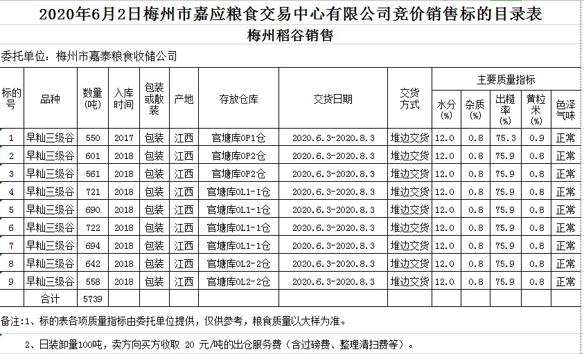 受客戶委托,梅州市嘉應糧食交易中心有限公司定于2020年6月2日(星期二)舉辦糧食競價交易會,梅州市嘉泰糧食收儲公司擬銷售2017年、2018年早秈稻5739噸。