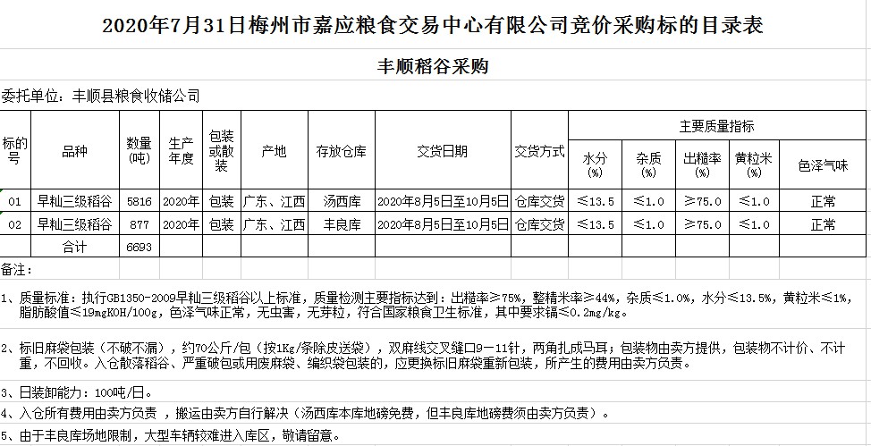 受客戶委托,梅州市嘉應糧食交易中心有限公司定于2020年7月31日(星期五)舉辦糧食競價交易會,豐順縣糧食收儲公司擬采購2020年早秈稻6693噸。