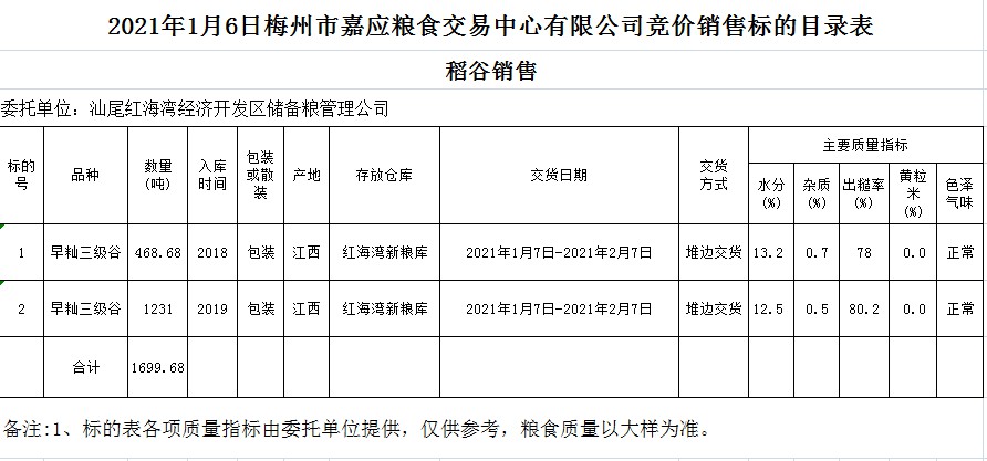 受客戶(hù)委托,梅州市嘉應(yīng)糧食交易中心有限公司定于2021年1月6日(星期三)舉辦糧食競(jìng)價(jià)交易會(huì),汕尾紅海灣經(jīng)濟(jì)開(kāi)發(fā)區(qū)儲(chǔ)備糧管理公司擬銷(xiāo)售2018年早秈三級(jí)稻谷468.68噸;2019年早秈三級(jí)稻谷1231噸。