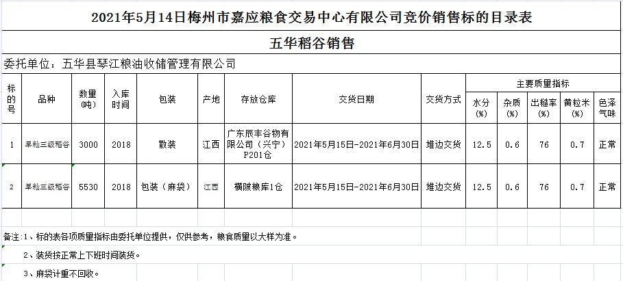 受客戶委托,梅州市嘉應糧食交易中心有限公司定于2021年5月14日(星期五)舉辦糧食競價交易會。五華縣琴江糧油收儲管理有限公司擬銷售2018年早秈稻8530噸。