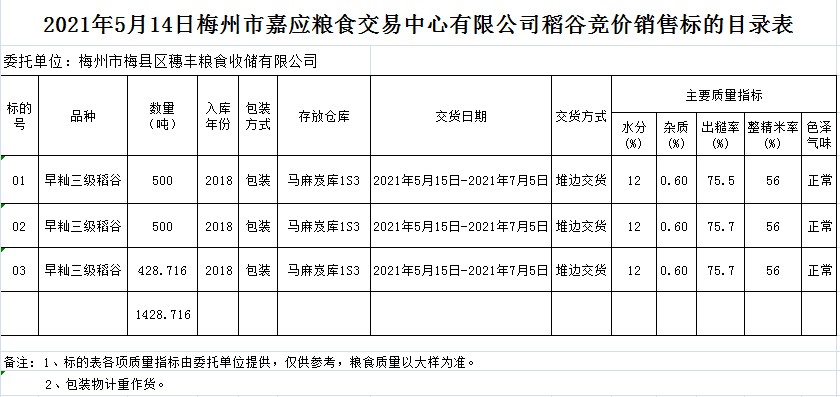 受客戶委托,梅州市嘉應(yīng)糧食交易中心有限公司定于2021年5月14日(星期五)舉辦糧食競價交易會。梅州市梅縣區(qū)穗豐糧食收儲有限公司擬銷售2018年早秈稻1428.716噸。