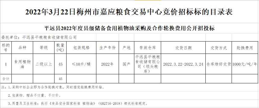 受客戶委托,梅州市嘉應(yīng)糧食交易中心有限公司定于2022年3月22日(星期二)上午10時在廣東省梅州市彬芳大道南161號梅州市糧食交易中心3樓,舉辦平遠(yuǎn)縣縣級食用植物油儲備采購及合作輪換費(fèi)公開招標(biāo)。