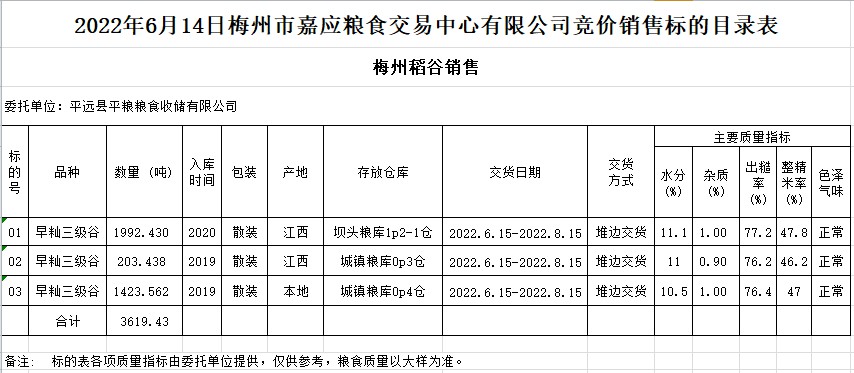 受客戶委托,梅州市嘉應(yīng)糧食交易中心有限公司定于2022年6月14日(星期二)舉辦糧食競價交易會。平遠(yuǎn)縣平糧糧食收儲有限公司擬銷售2019、2020年早秈稻3619.43噸。