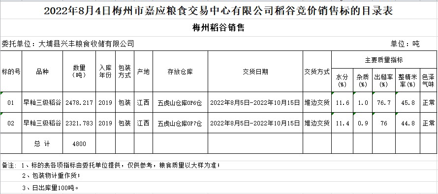受客戶委托,梅州市嘉應(yīng)糧食交易中心有限公司定于2022年8月4日(星期四)舉辦糧食競價(jià)交易會(huì)。大埔縣興豐糧食收儲有限公司擬銷售2019年早秈稻4800噸。