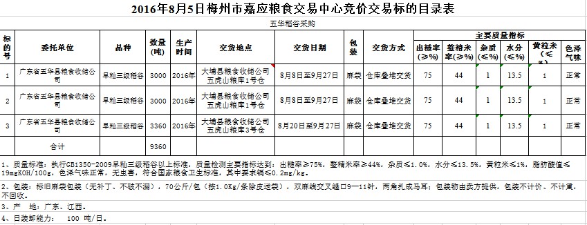 受客戶委托,梅州市嘉應(yīng)糧食交易中心有限公司定于2016年8月5日舉辦糧食競(jìng)價(jià)交易會(huì),廣東省五華縣糧食收儲(chǔ)公司擬采購(gòu)2016年產(chǎn)早秈三級(jí)稻谷9360噸。