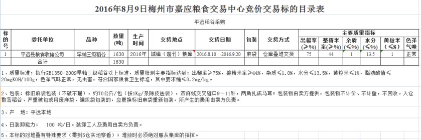 受客戶委托,梅州市嘉應(yīng)糧食交易中心有限公司定于201689日舉辦糧食競(jìng)價(jià)交易會(huì),平遠(yuǎn)縣糧食收儲(chǔ)公司擬采購2016年產(chǎn)早秈三級(jí)稻谷1630噸。