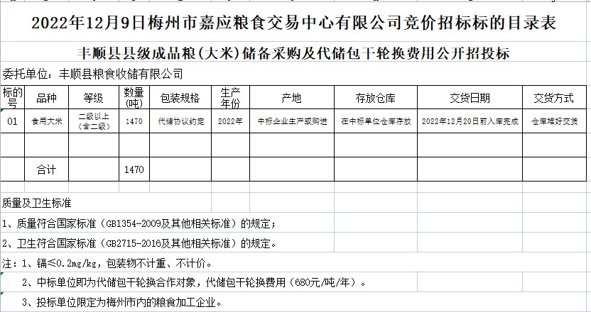 受客戶委托,梅州市嘉應糧食交易中心有限公司定于2022年12月9日(星期五)上午10時在廣東省梅州市彬芳大道南161號梅州市糧食交易中心3樓,舉辦豐順縣縣級動態(tài)儲備成品糧(食用大米)采購公開招標。