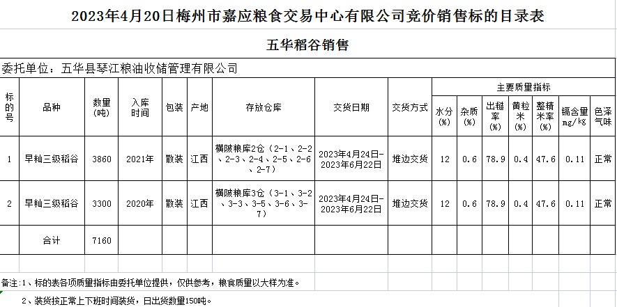 2023年4月20日五華縣琴江糧油收儲(chǔ)管理有限公司稻谷銷售