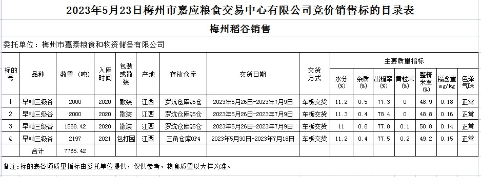受客戶委托,梅州市嘉應(yīng)糧食交易中心有限公司定于2023年5月23日(星期二)舉辦糧食競(jìng)價(jià)交易會(huì)。梅州市嘉泰糧食和物資儲(chǔ)備有限公司擬銷(xiāo)售2020年、2021年早秈稻7765.42噸。
