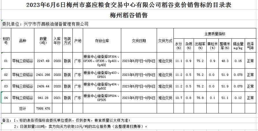 受客戶委托,梅州市嘉應(yīng)糧食交易中心有限公司定于2023年6月6日(星期二)舉辦糧食競(jìng)價(jià)交易會(huì)。興寧市齊昌糧油儲(chǔ)備管理有限公司擬銷售2020年、2021年早秈稻7999.476噸。
