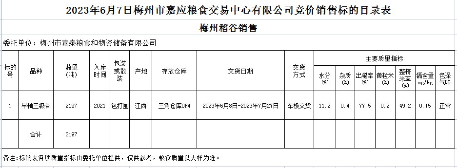 受客戶委托,梅州市嘉應糧食交易中心有限公司定于2023年6月7日(星期三)舉辦糧食競價交易會。梅州市嘉泰糧食和物資儲備有限公司擬銷售2021年早秈稻2197噸。