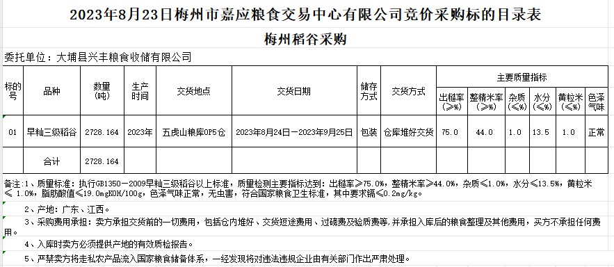 受客戶委托,梅州市嘉應(yīng)糧食交易中心有限公司定于2023年8月23日(星期三)舉辦糧食競(jìng)價(jià)交易會(huì)。大埔縣興豐糧食收儲(chǔ)有限公司擬采購(gòu)2023年早秈稻2728.164噸。