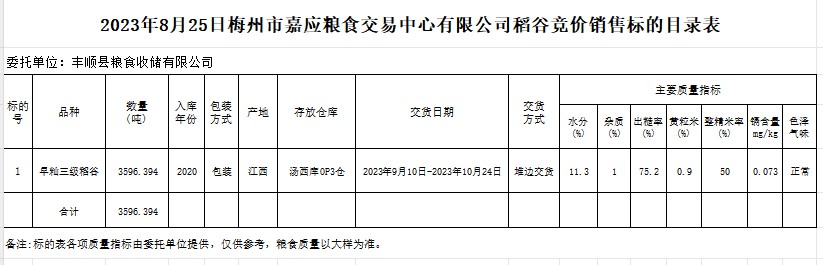 受客戶(hù)委托,梅州市嘉應(yīng)糧食交易中心有限公司定于2023年8月25日(星期五)舉辦糧食競(jìng)價(jià)交易會(huì)。豐順縣糧食收儲(chǔ)有限公司擬銷(xiāo)售2020年早秈稻3596.394噸。