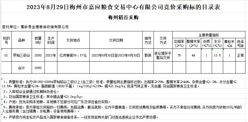 受客戶委托,梅州市嘉應(yīng)糧食交易中心有限公司定于2023年8月29日(星期二)舉辦糧食競價(jià)交易會(huì)。蕉嶺縣金穗糧食收儲(chǔ)有限公司擬采購2023年產(chǎn)早秈稻2000噸。