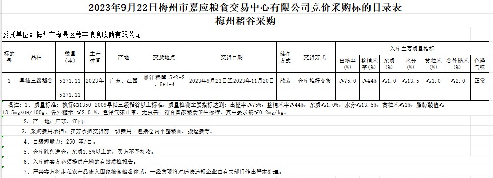 受客戶委托,梅州市嘉應(yīng)糧食交易中心有限公司定于2023年9月22日(星期五)舉辦糧食競價(jià)交易會。梅州市梅縣區(qū)穗豐糧食收儲有限公司擬采購2023年產(chǎn)早秈稻5371.11噸。