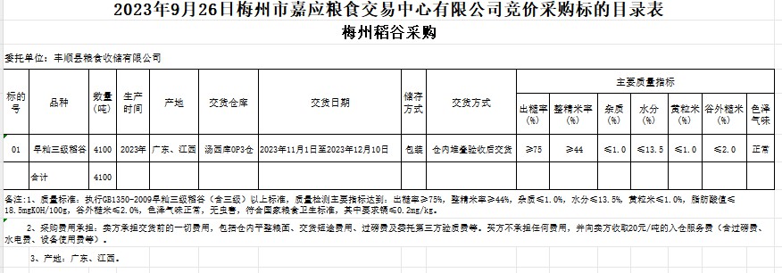 受客戶委托,梅州市嘉應糧食交易中心有限公司定于2023年9月26日(星期二)舉辦糧食競價交易會。豐順縣糧食收儲有限公司擬采購2023年早秈稻谷4100噸。