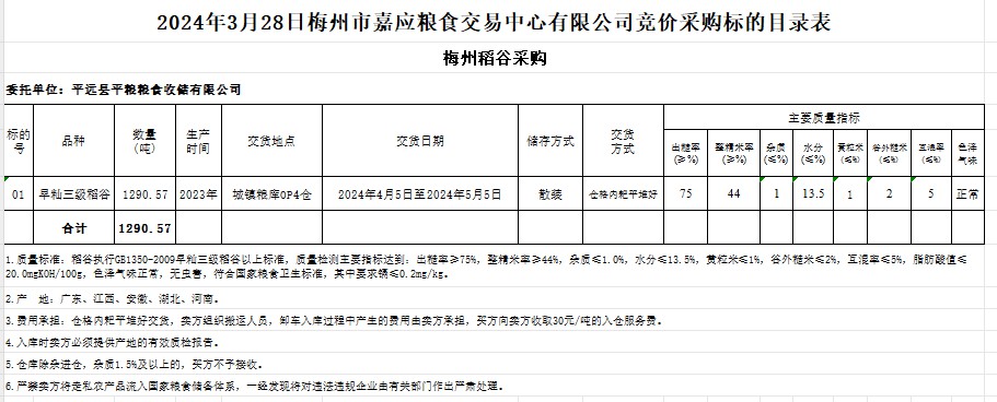 受客戶委托,梅州市嘉應(yīng)糧食交易中心有限公司定于2024年3月28日(星期四)舉辦糧食競(jìng)價(jià)交易會(huì)。平遠(yuǎn)縣平糧糧食收儲(chǔ)有限公司擬采購(gòu)2023年產(chǎn)早秈稻1290.57噸。