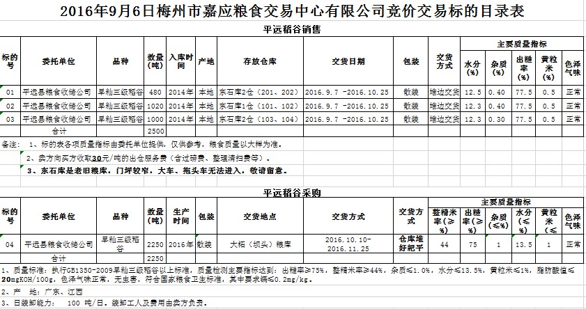 受客戶委托,平遠(yuǎn)縣糧食收儲(chǔ)公司擬銷售2014年早秈三級(jí)稻谷2500噸、采購2016年產(chǎn)早秈三級(jí)稻谷2250噸。