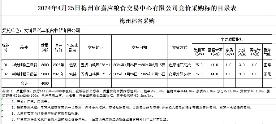 受客戶委托,梅州市嘉應(yīng)糧食交易中心有限公司定于2024年4月25日(星期四)舉辦糧食競價(jià)交易會(huì)。大埔縣興豐糧食收儲(chǔ)有限公司擬采購2023年產(chǎn)中晚秈稻谷4000噸。