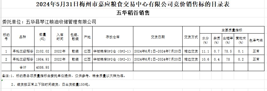 受客戶委托,梅州市嘉應(yīng)糧食交易中心有限公司定于2024年5月31日(星期五)舉辦糧食競價(jià)交易會。五華縣琴江糧油收儲管理有限公司擬銷售2022年產(chǎn)早秈稻4086.95噸。