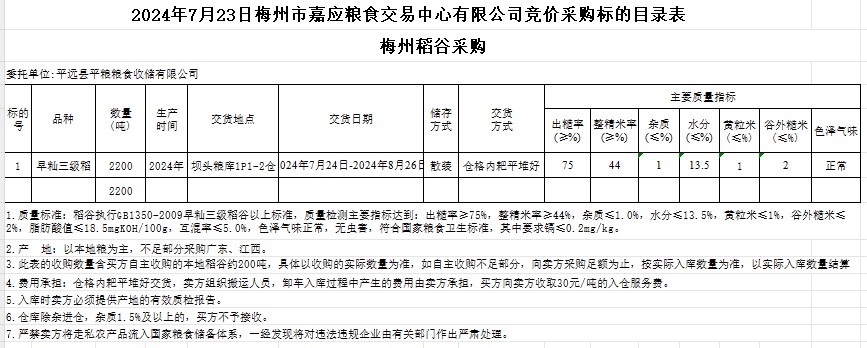 受客戶委托,梅州市嘉應(yīng)糧食交易中心有限公司定于2024年7月23日(星期二)舉辦糧食競價(jià)交易會(huì)。平遠(yuǎn)縣平糧糧食收儲(chǔ)有限公司擬采購2024年產(chǎn)早秈稻谷2200噸。