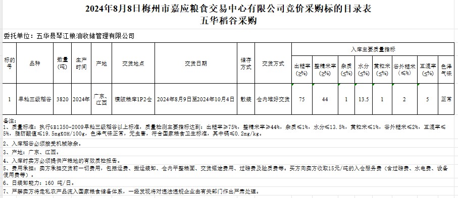 受客戶委托,梅州市嘉應糧食交易中心有限公司定于2024年8月8日(星期四)舉辦糧食競價交易會。五華縣琴江糧油收儲管理有限公司擬采購2024年產早秈稻谷3820噸。