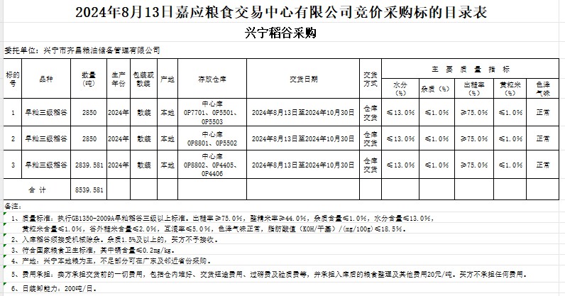受客戶委托,梅州市嘉應糧食交易中心有限公司定于2024年8月13日(星期二)舉辦糧食競價交易會。興寧市齊昌糧油儲備管理有限公司擬采購2024年產(chǎn)早秈稻8539.581噸。