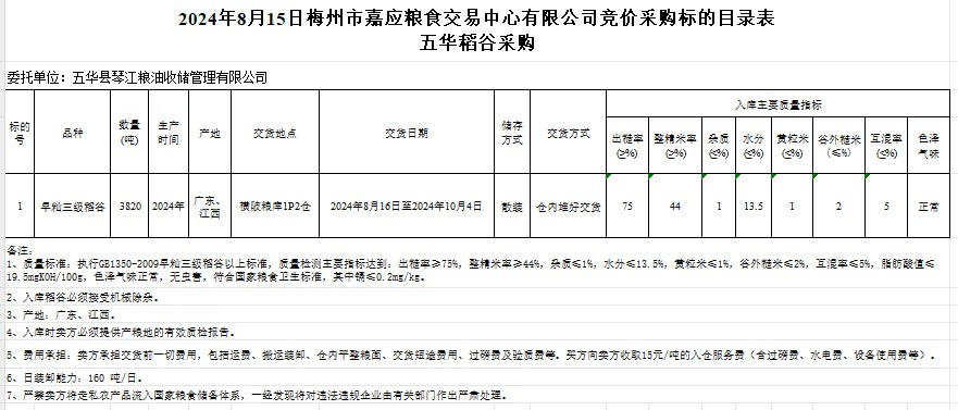 2024年8月15日五華縣琴江糧油收儲管理有限公司稻谷采購