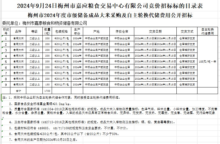 文件下載:2024年9月24日梅州市2024年度市級(jí)儲(chǔ)備成品大米采購(gòu)及自主輪換代儲(chǔ)費(fèi)用公開(kāi)招標(biāo)公告