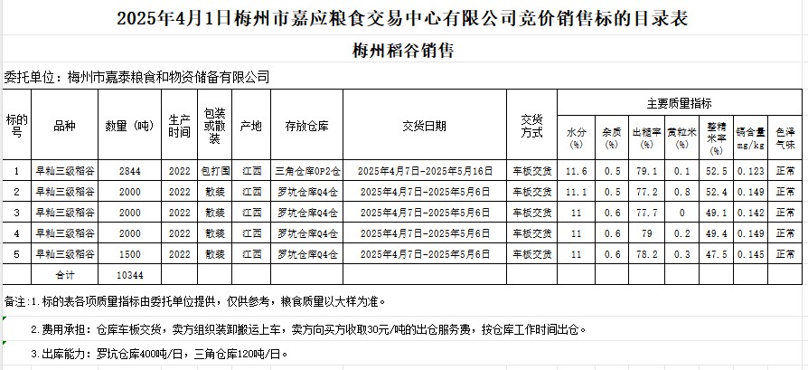 受客戶委托,梅州市嘉應(yīng)糧食交易中心有限公司定于2025年4月1日(星期二)舉辦糧食競(jìng)價(jià)交易會(huì)。梅州市嘉泰糧食和物資儲(chǔ)備有限公司擬銷售2022年產(chǎn)早秈稻谷10344噸。