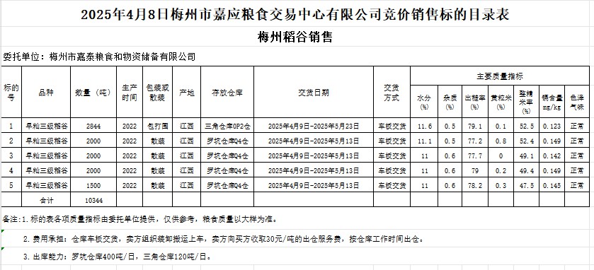 受客戶委托,梅州市嘉應(yīng)糧食交易中心有限公司定于2025年4月8日(星期二)舉辦糧食競(jìng)價(jià)交易會(huì)。梅州市嘉泰糧食和物資儲(chǔ)備有限公司擬銷售2022年產(chǎn)早秈稻谷10344噸。