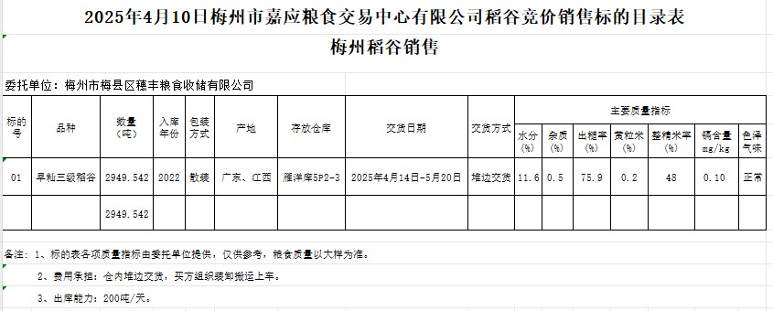 受客戶委托,梅州市嘉應糧食交易中心有限公司定于2025年4月10日(星期四)舉辦糧食競價交易會。梅州市梅縣區(qū)穗豐糧食收儲有限公司擬銷售2022年產(chǎn)早秈稻谷2949.542噸。
