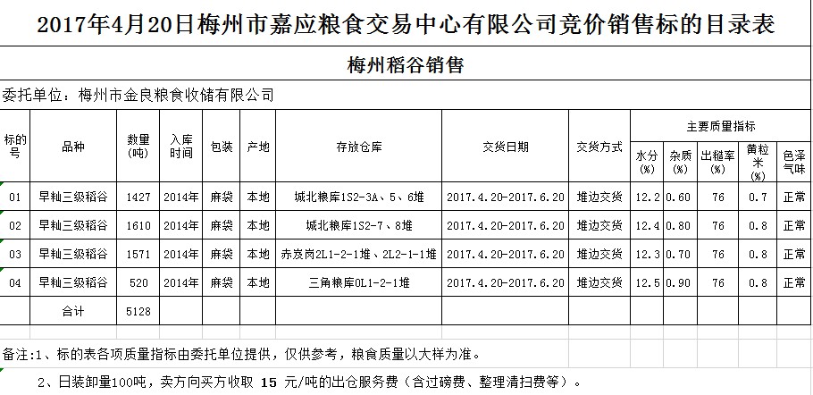 受客戶委托,梅州市嘉應糧食交易中心有限公司定于2017年4月20日舉辦糧食競價交易會,梅州市金良糧食收儲有限公司擬銷售2014年早秈三級稻谷5128噸。
