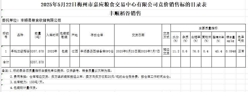 受客戶委托,梅州市嘉應(yīng)糧食交易中心有限公司定于2025年5月22日(星期四)舉辦糧食競價(jià)交易會(huì)。豐順縣糧食收儲(chǔ)有限公司擬銷售2022年產(chǎn)早秈稻谷5207.878噸。