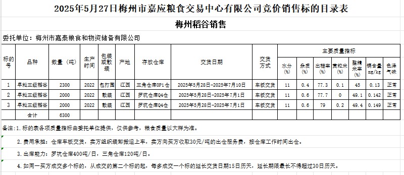受客戶委托,梅州市嘉應糧食交易中心有限公司定于2025年5月27日(星期二)舉辦糧食競價交易會。梅州市嘉泰糧食和物資儲備有限公司擬銷售2022年產早秈稻谷6300噸。