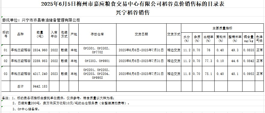 受客戶委托,梅州市嘉應(yīng)糧食交易中心有限公司定于2025年6月5日(星期四)舉辦糧食競(jìng)價(jià)交易會(huì)。興寧市齊昌糧油儲(chǔ)備管理有限公司擬銷(xiāo)售2022年、2023年產(chǎn)早秈稻谷9442.183噸。