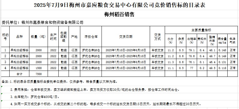 受客戶委托,梅州市嘉應(yīng)糧食交易中心有限公司定于2025年7月9日(星期三)舉辦糧食競(jìng)價(jià)交易會(huì)。梅州市嘉泰糧食和物資儲(chǔ)備有限公司擬銷售2022年產(chǎn)早秈稻谷7500噸。